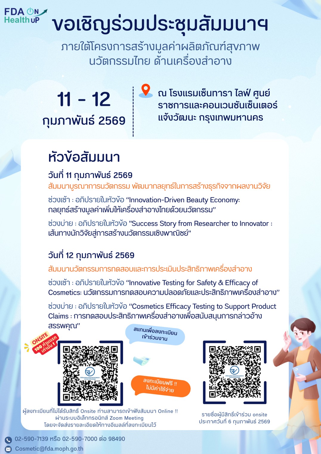 📣ประชาสัมพันธ์ ขอเชิญเข้าร่วมการประชุมสัมมนาโครงการสร้างมูลค่าผลิตภัณฑ์สุขภาพนวัตกรรมไทย ด้านเครื่องสำอาง
